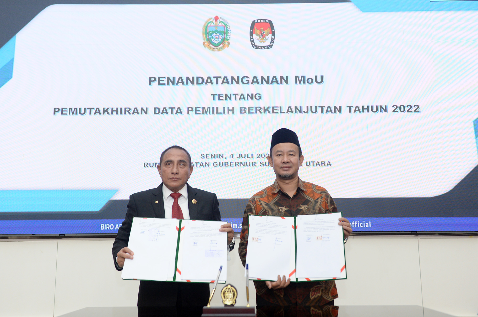 Kerja sama tersebut ditandai dengan penandatanganan Nota Kesepahaman atau Memorandum of Understanding (MoU) oleh Gubernur Sumut Edy Rahmayadi dan Ketua KPU Sumut Herdensi di Rumah Dinas Gubernur Sumut, Jalan Jenderal Sudirman Nomor 41, Medan, Senin (4/7/2022).