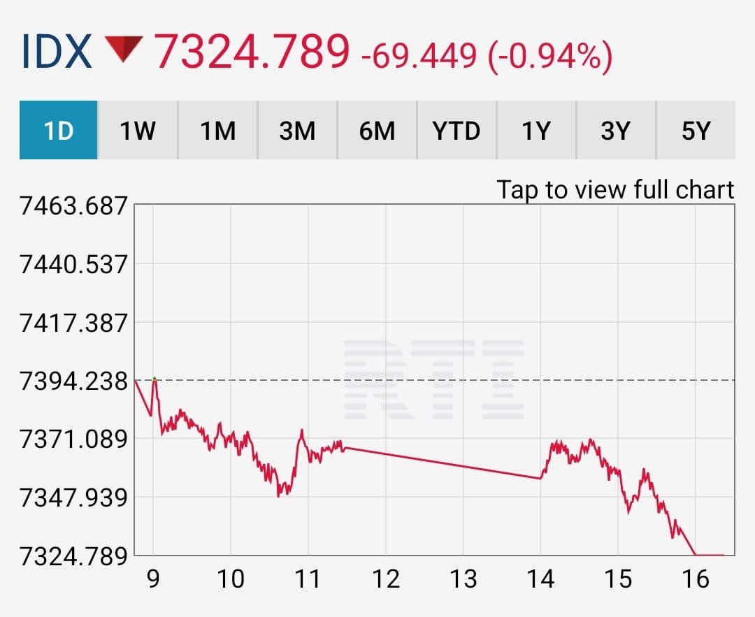 Pelemahan Rupiah ini juga mengantarkan keterpurukan bagi Indeks Harga Saham Gabungan (IHSG) yang ditutup melemah 0,94% di level 7.324,789.