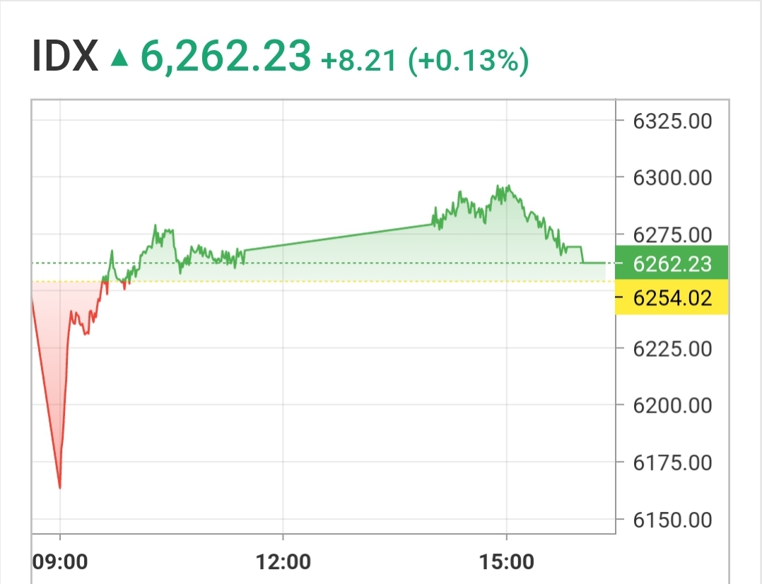 LensaMedan - Indeks Harga Saham Gabungan (IHSG) yang sempat melemah di sesi permbukaan perdagangan, dan sempat menyentuh level terendah 6.148, berubah arah dan ditutup menguat tipis 0,13% di level 6.262,226.Mayoritas bursa di Asia yang terpantau melemah di sesi perdagangan pagi, sebagian juga berbalik menguat pada sesi penutupan.